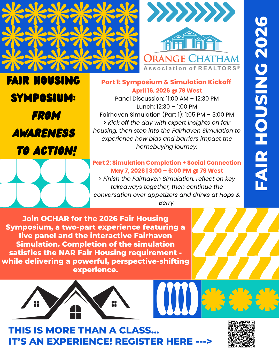DESCRIPTION:<p>Join the <a href="https://www.orangechathamrealtors.com/" target="_blank" rel="noopener">Orange Chatham Association of REALTORS® </a>for our 2026 Fair Housing Symposium\, a two-part experience designed to challenge perspectives\, deepen understanding\, and equip you with the tools to serve your clients and community with integrity.</p>\n<p><strong>Part 1: Symposium &amp; Simulation Kickoff<br />\n</strong>April 16\, 2026 @ 79 West in Pittsboro</p>\n<ul>\n<li>Panel Discussion: 11:00 AM – 12:30 PM</li>\n<li>Lunch: 12:30 – 1:00 PM</li>\n<li>Fairhaven Simulation (Part 1): 1:05 PM – 3:00 PM</li>\n</ul>\n<p>We’ll kick off the day with a dynamic panel of industry experts sharing real-world insight on fair housing practices\, challenges\, and accountability in today’s market. After lunch\, participants will begin the <strong>Fairhaven Simulation</strong>\, an interactive learning experience that puts you in the role of a consumer navigating the homebuying process &#8211; revealing how bias and systemic barriers can impact outcomes.</p>\n<p><em><strong>Our Panel Includes:</strong></em></p>\n<ul>\n<li>Mrs. Valencia Thompson\, Certified HUD Housing Counselor with EMPOWERment\, Inc.</li>\n<li>Ms. Sharron Reid\, Certified HUD Housing Counselor with EMPOWERMENT\, Inc.</li>\n<li>Attorney Tom Holt with Bagwell Holt Smith P.A.</li>\n<li>Mr. Jamarius Jones\, Intake Specialist with EMPOWERMENT\, Inc.</li>\n<li>Mr. Brian Summers\, Lender with Fifth Third Bank</li>\n<li>Mrs. Shenekia Weeks-Parrish\, Town of Chapel Hill\, Human Relations Department</li>\n</ul>\n<p><strong>Part 2: Simulation Completion + Social Connection</strong><br />\nMay 7\, 2026 | 3:00 – 6:00 PM</p>\n<p>We’ll reconvene to complete the Fairhaven Simulation and come together for a guided discussion on key takeaways\, reflections\, and how to apply what you’ve learned in your business.</p>\n<p>We’ll wrap up the experience at <a href="https://www.mosaicatchathampark.com/tenant/hops-and-berry/" target="_blank" rel="noopener"><strong>Hops &amp; Berry </strong></a>with appetizers and drinks &#8211; because meaningful conversations don’t stop when the session ends.</p>\n<p><strong>Why Attend?</strong></p>\n<ul>\n<li>Gain a deeper understanding of fair housing laws and real-life implications</li>\n<li>Experience the homebuying process from a new perspective</li>\n<li>Engage in honest\, impactful conversations with industry peers</li>\n<li>Walk away with actionable insights you can apply immediately</li>\n</ul>\n<p><strong>Meet Your Requirement &#8211; In a Meaningful Way<br />\n</strong>Completion of the <strong>Fairhaven Simulation </strong>satisfies the National Association of REALTORS® Fair Housing training requirement &#8211; so you’re not just checking a box\, you’re gaining an experience that will change how you show up for your clients.</p>\n<p><strong>Who Should Attend?<br />\n</strong>REALTORS®\, brokers\, industry partners\, and anyone committed to ethical\, equitable housing practices.</p>\n<p><strong><a href="https://members.orangechathamrealtors.com/ap/Events/Register/NaFlkXKUYCaCm" target="_blank" rel="noopener">Register for free!</a></strong></p>\n<p><img fetchpriority="high" decoding="async" class="alignnone wp-image-5802" src="https://www.mosaicatchathampark.com/wp-content/uploads/Fair-Housing-Symposium-From-Awareness-to-Action.webp" alt="" width="367" height="459" srcset="https://www.mosaicatchathampark.com/wp-content/uploads/Fair-Housing-Symposium-From-Awareness-to-Action.webp 1080w\, https://www.mosaicatchathampark.com/wp-content/uploads/Fair-Housing-Symposium-From-Awareness-to-Action-240×300.webp 240w\, https://www.mosaicatchathampark.com/wp-content/uploads/Fair-Housing-Symposium-From-Awareness-to-Action-819×1024.webp 819w\, https://www.mosaicatchathampark.com/wp-content/uploads/Fair-Housing-Symposium-From-Awareness-to-Action-768×960.webp 768w" sizes="(max-width: 367px) 100vw\, 367px" /></p>\n<p>The post <a href="https://www.mosaicatchathampark.com/event/chatham-chamber-fair-housing-symposium-kickoff/">Chatham Chamber: Fair Housing Symposium Kickoff</a> appeared first on <a href="https://www.mosaicatchathampark.com">MOSAIC at Chatham Park</a>.</p>